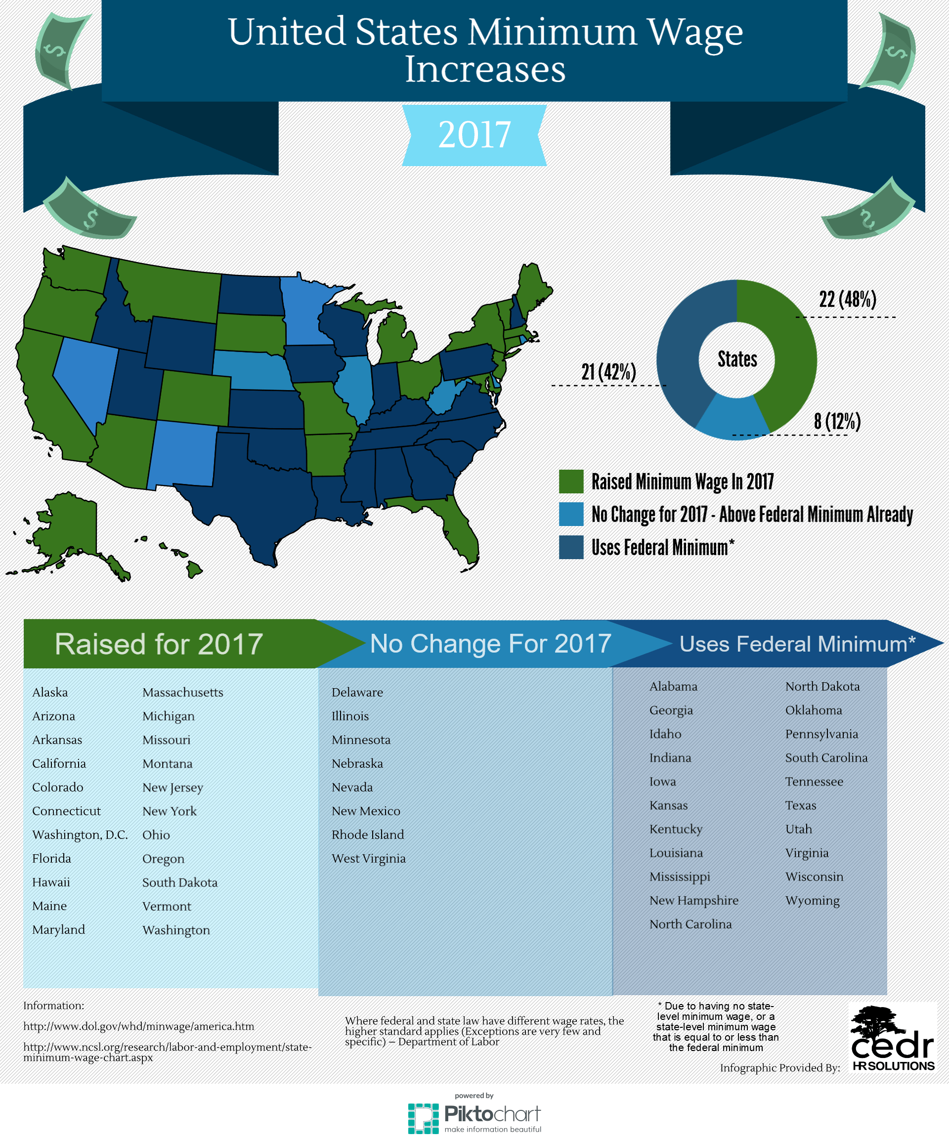 CEDR’s 2017 Minimum Wage infographic is a great way to make sure you’re aware of recent changes and are paying all employees properly for their time. Simply hover the mouse cursor over a state to see what changes will occur in 2017, or confirm your state’s current minimum wage. Plus, take a look at your neighboring states to see how your minimum wages compare!