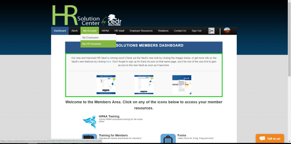 If you’ve been meaning to ask us anything, to look up a resource, or you just want to see what we’re so excited about, log in and check out your upgrade right now! Here’s the link to the Members Area. When you’re there, just look for the My Account tab at the top, and click on “My HR Requests.” It’s that simple.